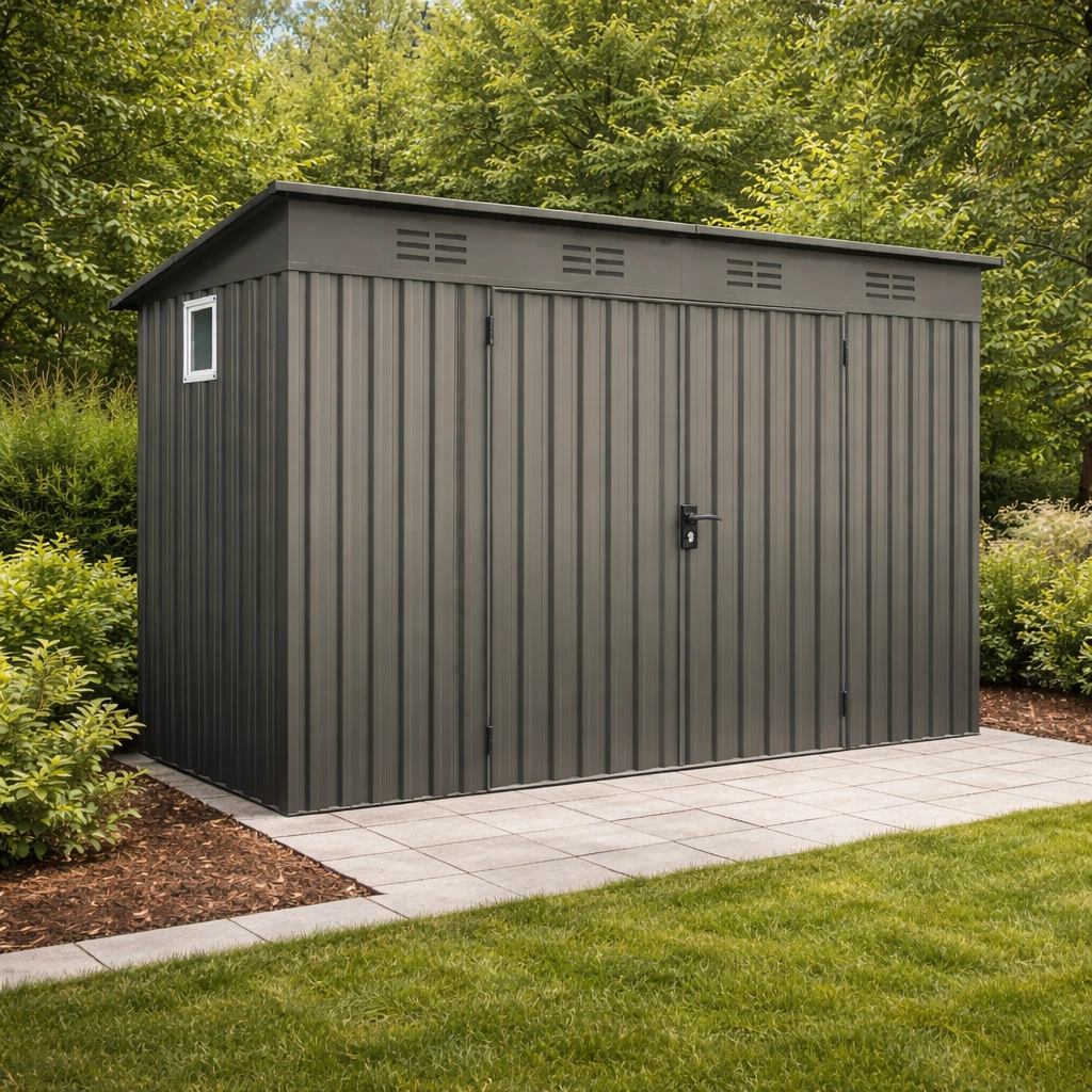 Abri de jardin métallique gris avec fenêtre et porte verrouillable