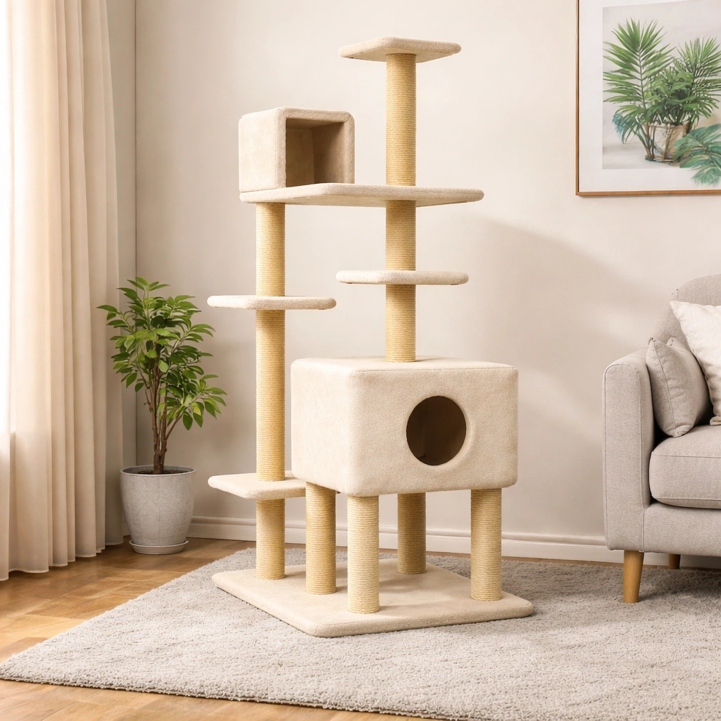 Arbre à chat en bois et sisal beige
