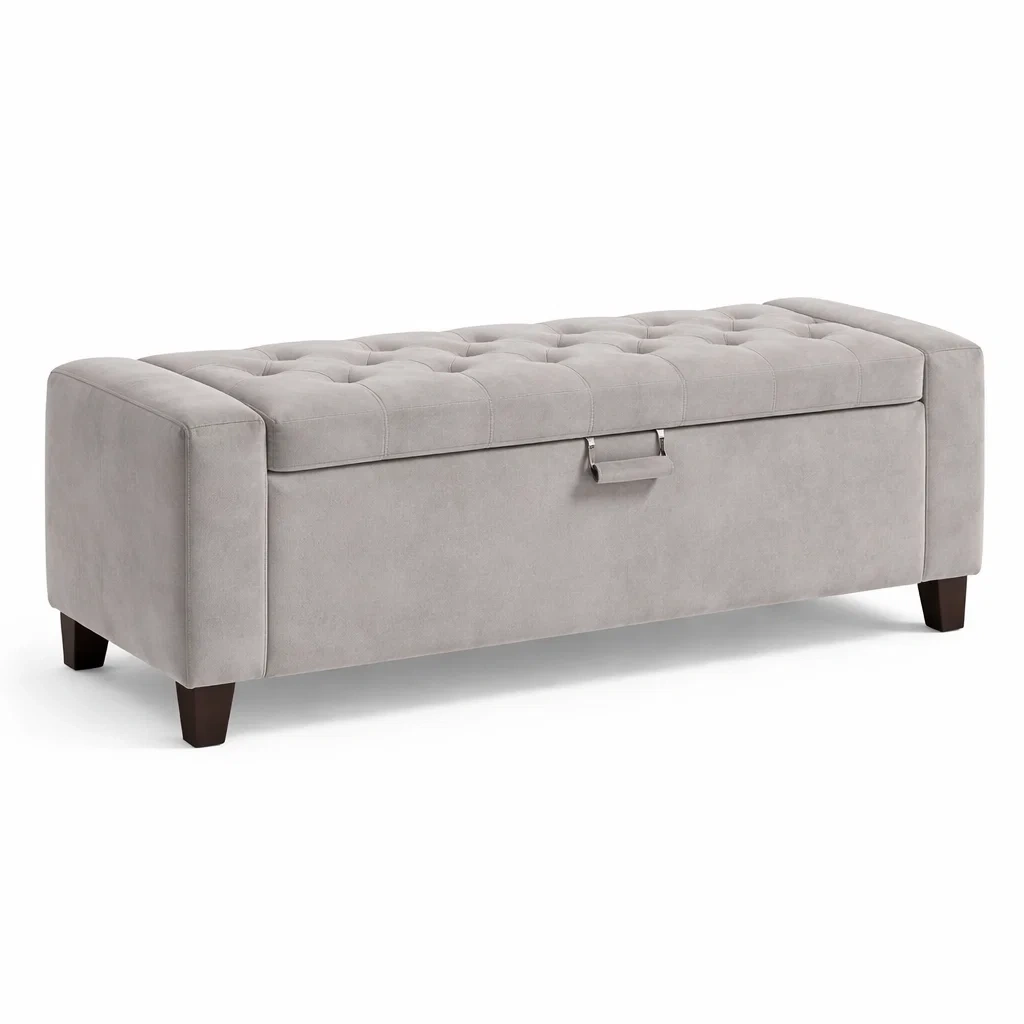 Banc de rangement en tissu gris avec pieds en bois