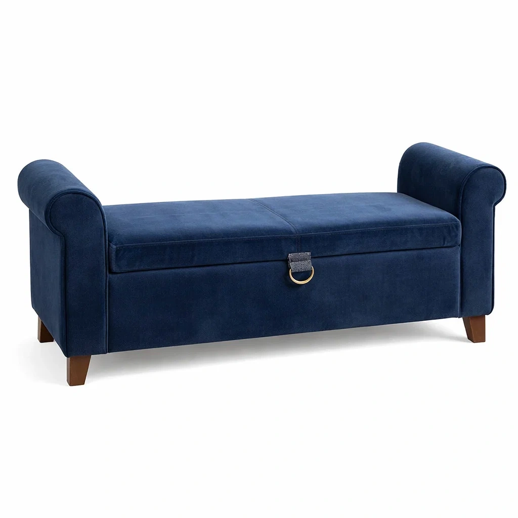 Banc de rangement en velours bleu avec pieds en bois