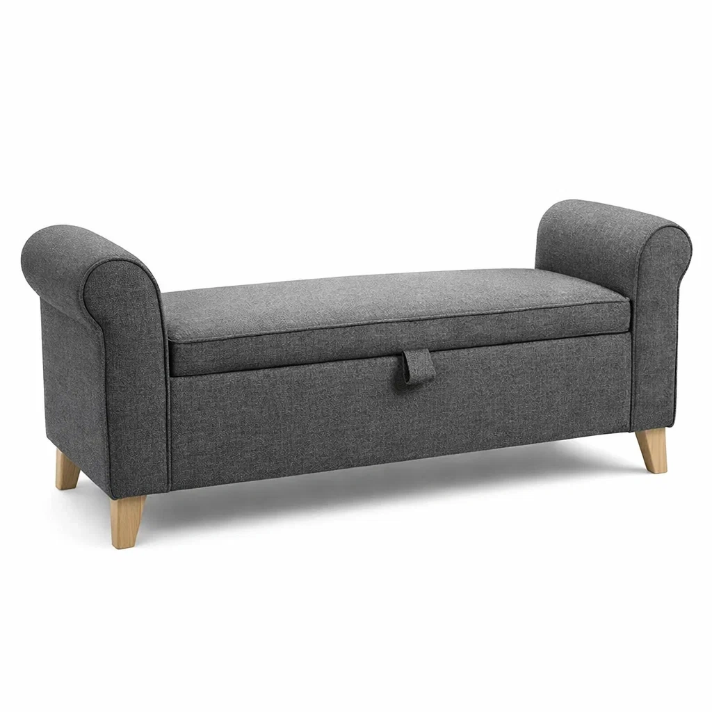 Banc de rangement en tissu polyester gris avec pieds en bois